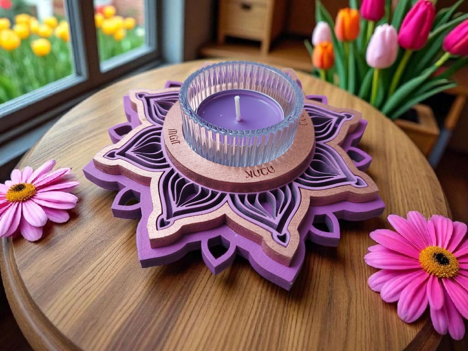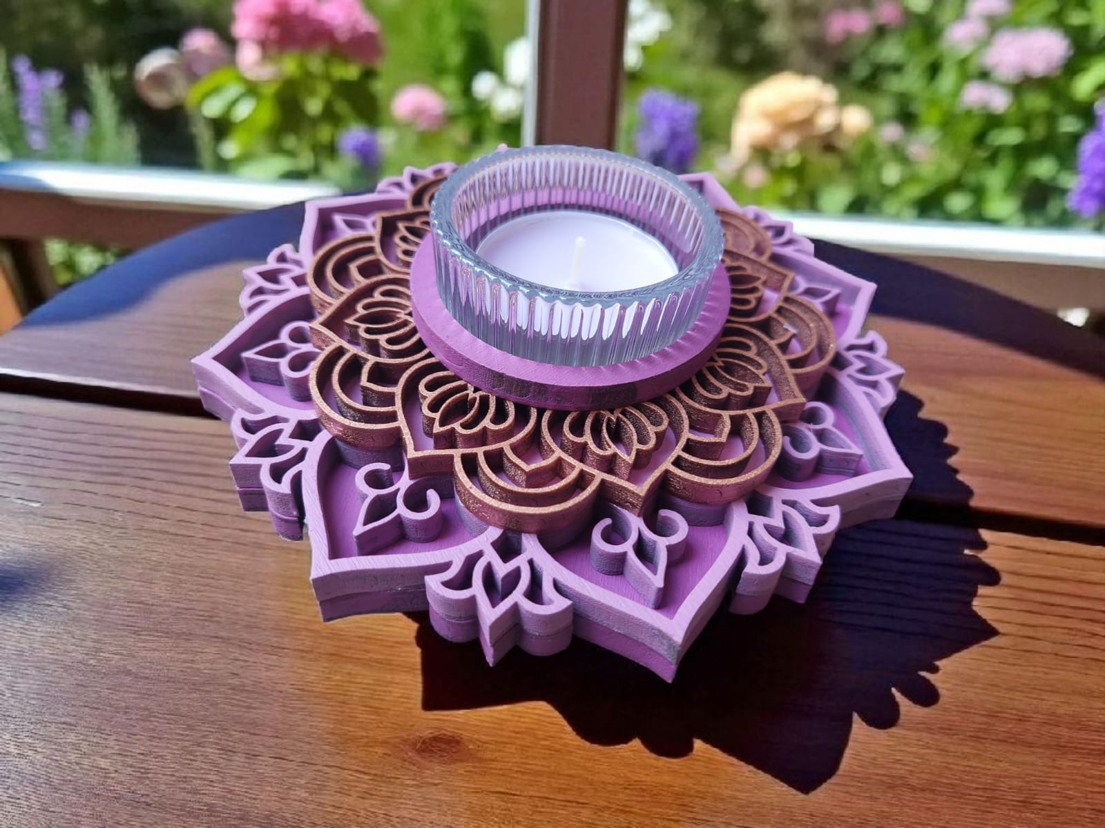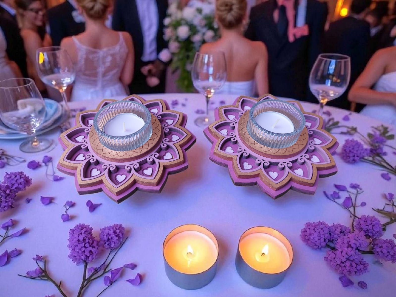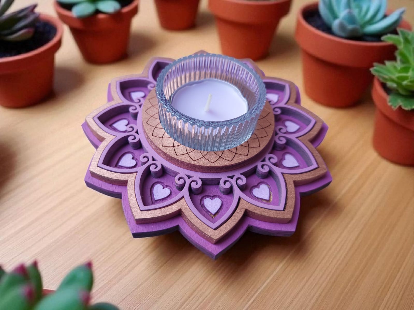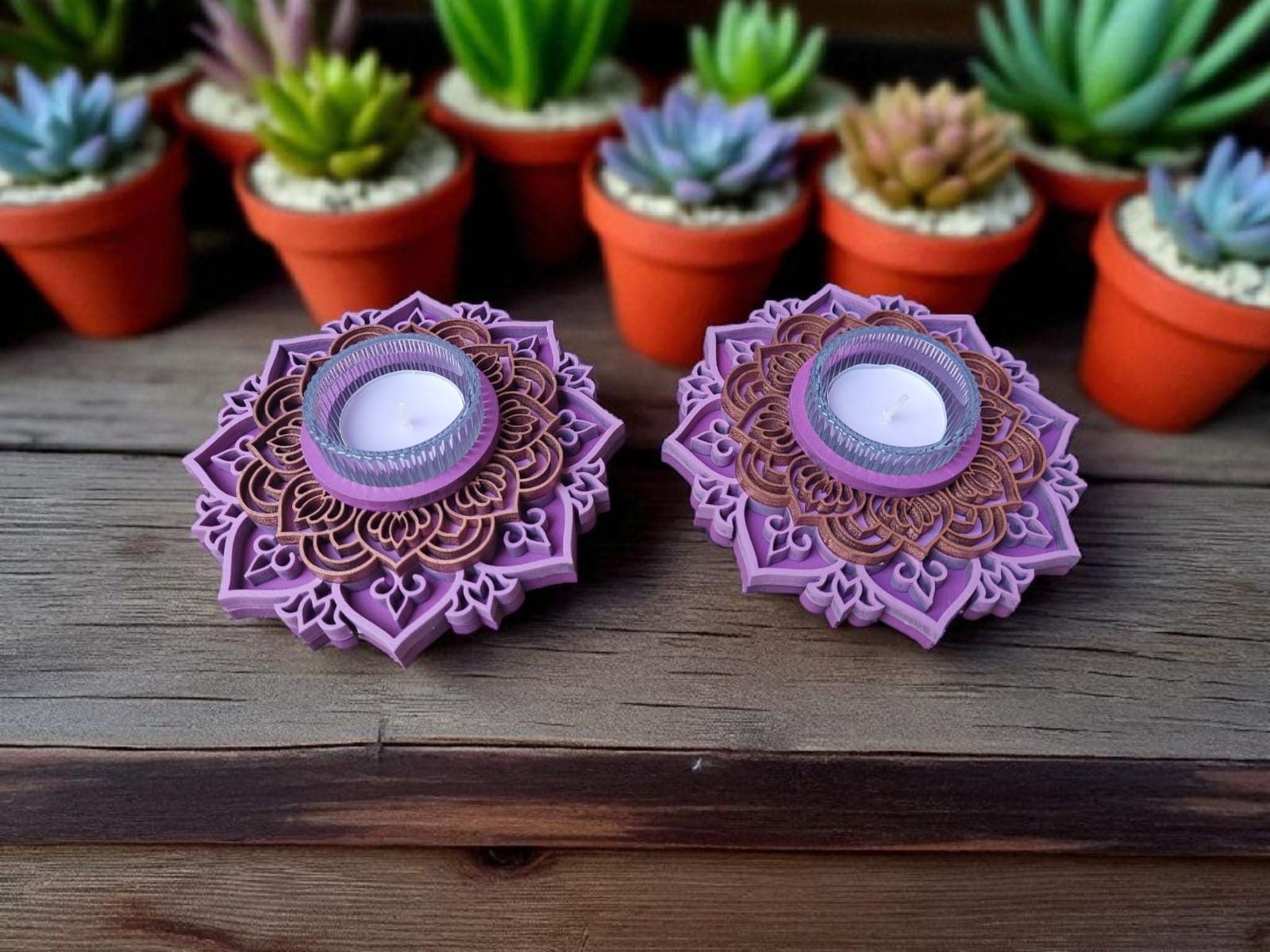 זוג פמוטים בעבודת יד, בעיצוב מנדלות עדינות ומרובדות, היוצר מראה תלת־מימדי חמים ומיוחד ובתוכן כוס זכוכית ובו נר ריחני.