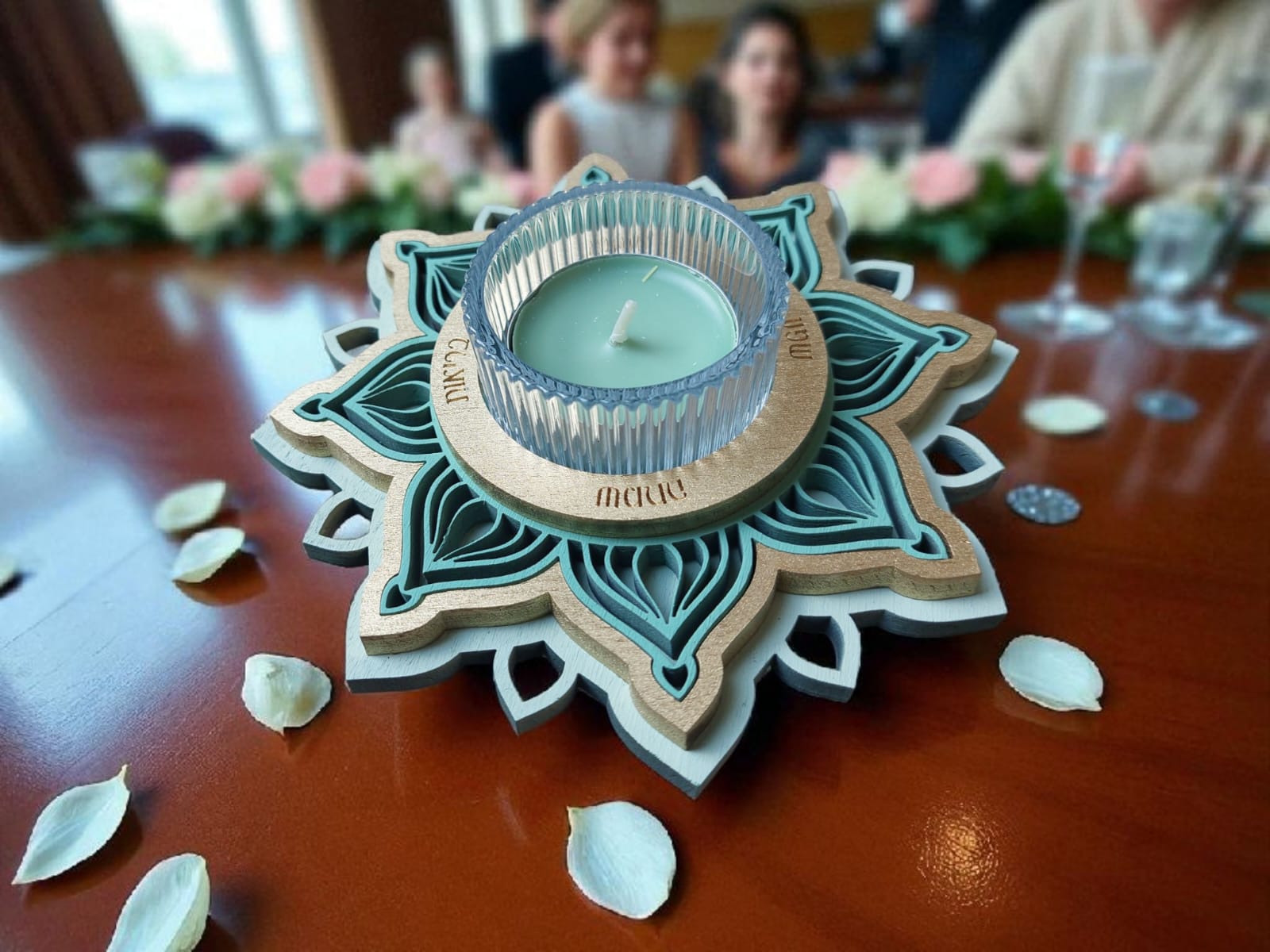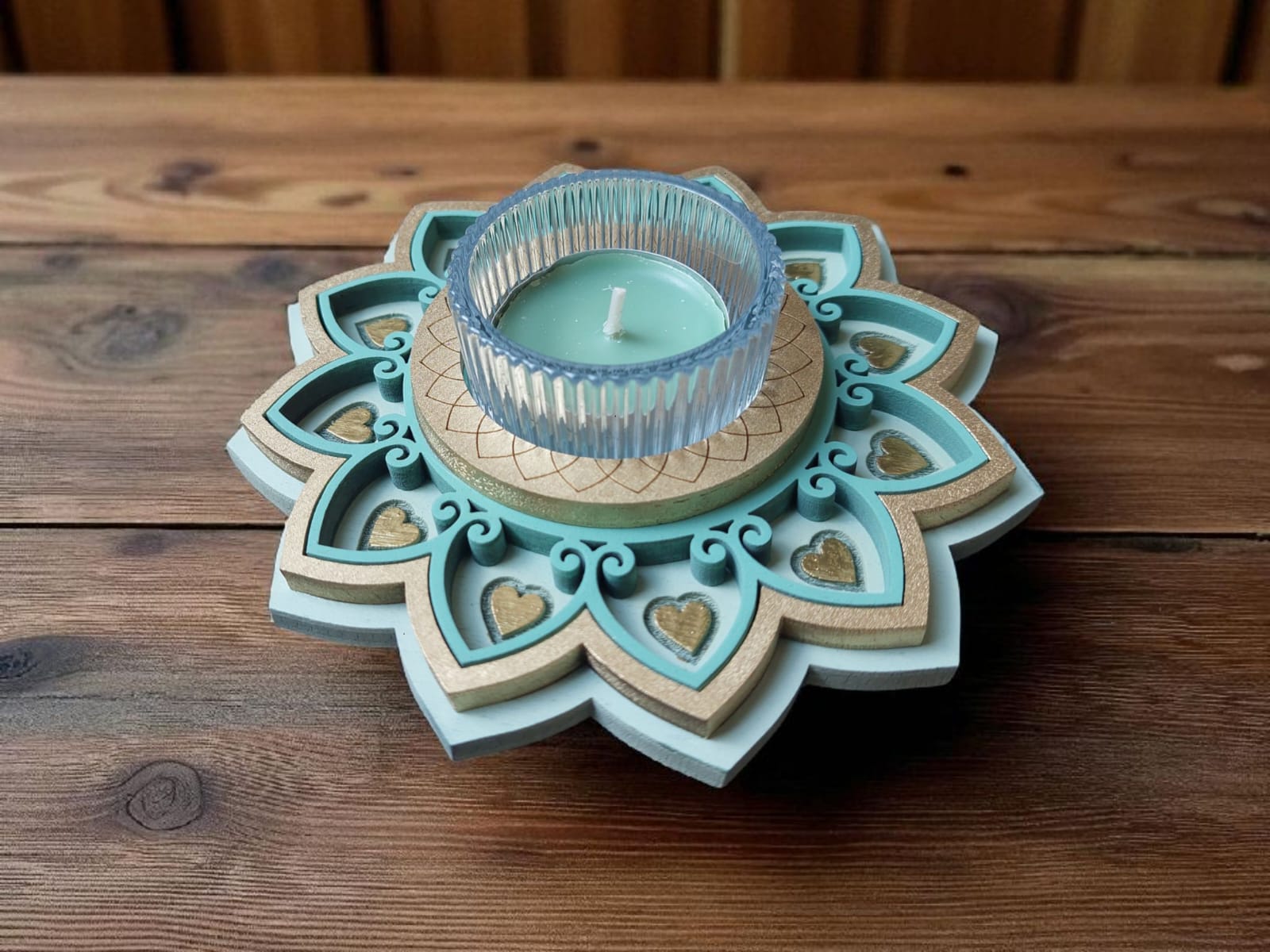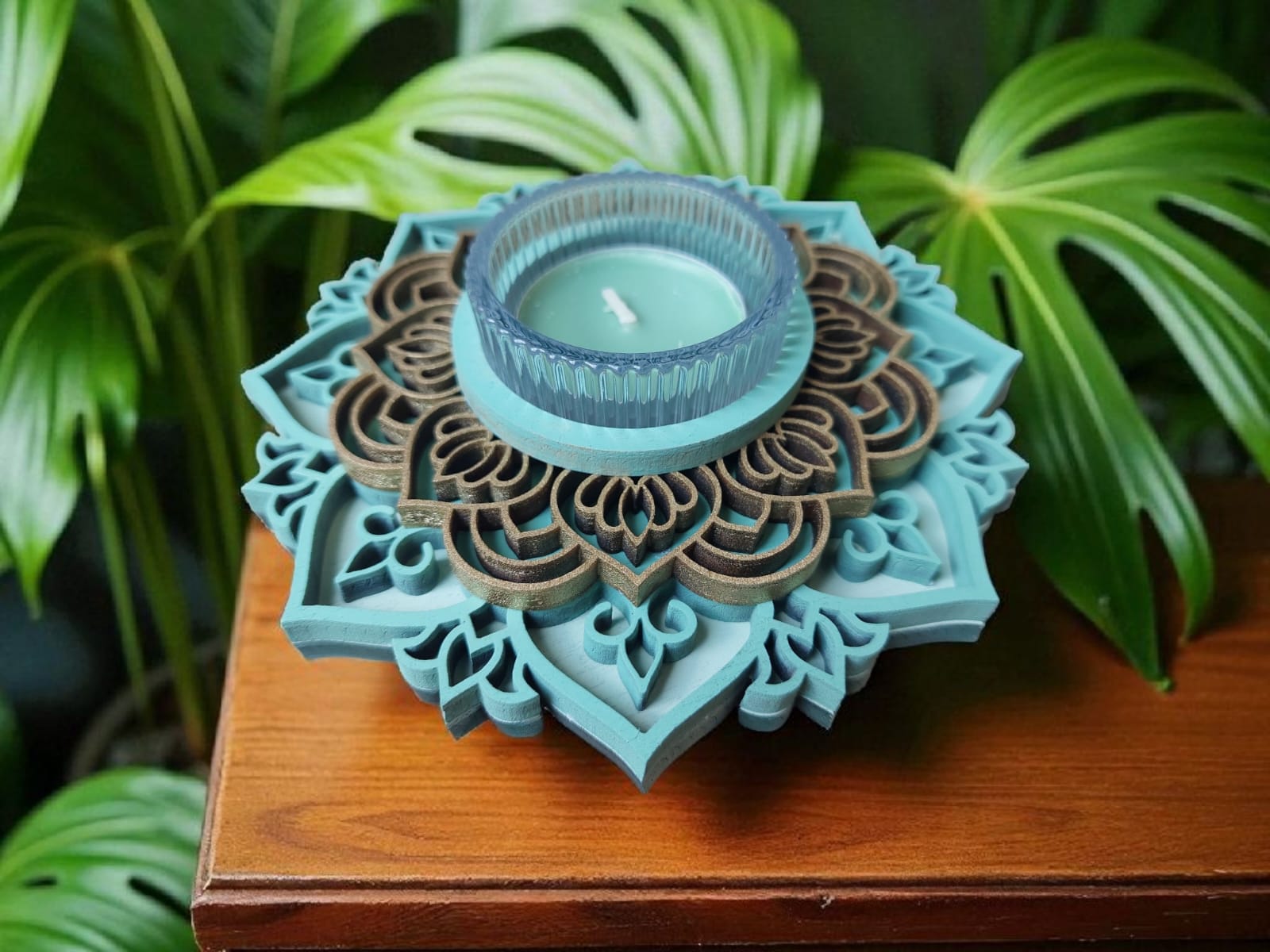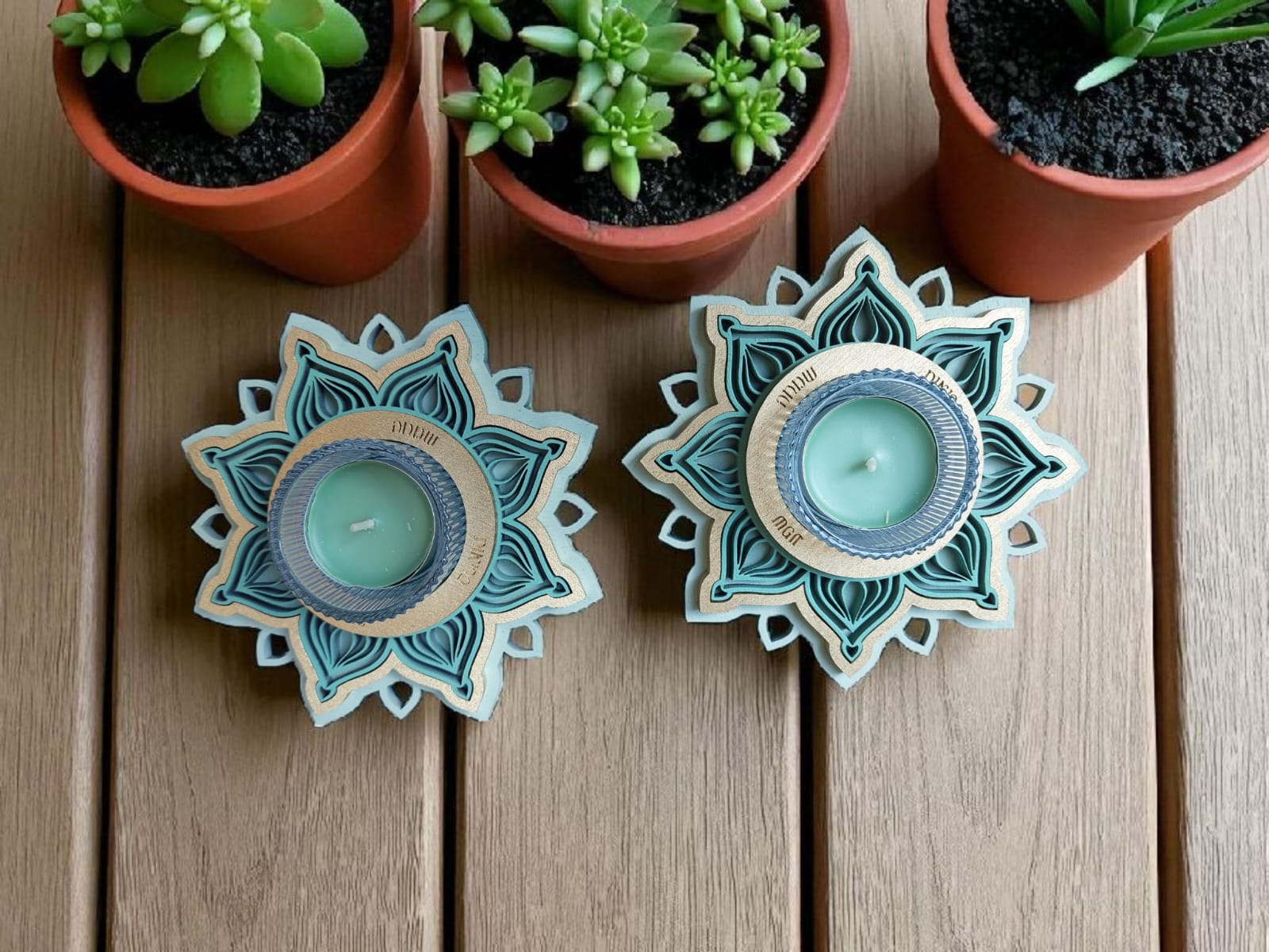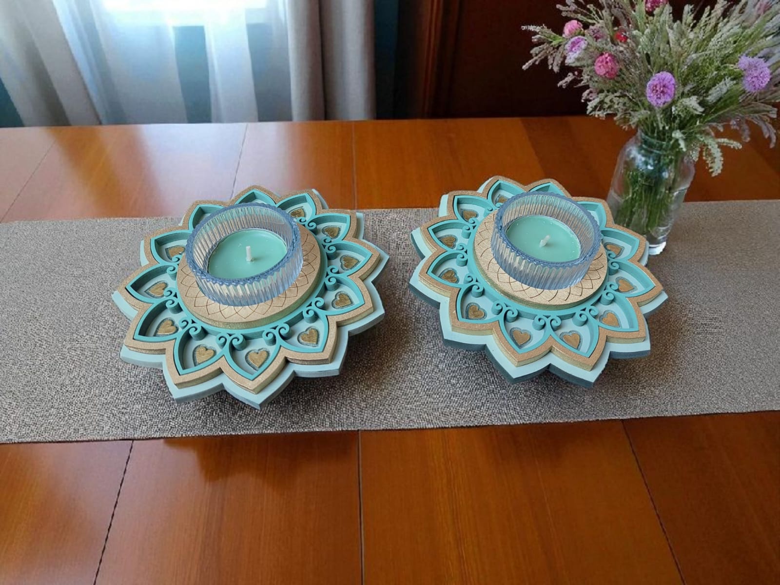 זוג פמוטים בעבודת יד, בעיצוב מנדלות עדינות ומרובדות, היוצר מראה תלת־מימדי חמים ומיוחד ובתוכן כוס זכוכית ובו נר ריחני.